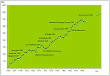 The collection size in 1968 was 19,000 items, mostly books and magazine.[10] This increased to over 63,000 items in 1992, and included a much more diverse range of media, from children's puzzles to archives, as well as the provision of stock from other branches, and access to system-wide databases.[163] By 2003 Birkenhead's stock had risen to 67,500.[35] Shortly afterwards, the library was temporarily relocated to the Leisure Centre where there was only room to house 40–50% of the collection.[38]