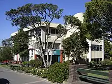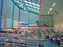 In 2005, in preparation for building works on the same site, the library was shifted to a converted basketball court in the Birkenhead Leisure Centre in Mahara Avenue (pictured). Other alternative sites had been considered, but most were found to be either inappropriate or too expensive.[38] With limited space available for services, the Plunket, Citizen's Advice Bureau (CAB), and council Area Office had to find alternative premises.[39][40] In fact only 50% to 60% of the library's own stock could be accommodated.[38]
