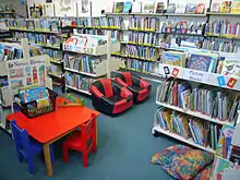 Lapsit for preschoolers with their parents was an innovation launched by then Chief Librarian Rata Graham in 1992. These were half-hour sessions of mostly music and song, as well as stories and finger puppetry.[143] Lapsit proved so popular it was extended to twice a week in 1999.[144] It was the precursor to "Rhymetime" now standardised across the entire North Shore Libraries system, a programme specifically designed to encourage active socialisation and the development of reading skills, through the focus on rhythm and rhyme.[145]