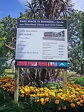 On 23 February 2005, public submissions closed and a fitout of the temporary site in the Leisure Centre was begun.[64] Total cost for the new library was now expected to be $6.5 million,[65] then $7.3 million.[66] The project was then delayed, requiring a change to the district plan (see below). In late 2005, the Council Community Services General Manager, Loretta Burnett, stated: "There will be additional costs associated with a plan change but they are modest in comparison."[11] However, subsequent further delays lifted the cost to the region of $9.25 to $9.5 million as of the end of 2007, with a budget shortfall of $2.75 million.[66][67]