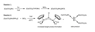 Adding to this, Huttner et al. described the synthesis of mixed Mn-Bi compounds. Most of the synthetic routes use bismuth trichloride as the bismuth metal source.[5] The first proposed route relied on manganese cyclopentadienyl tricarbonyl as the starting material. A better yielding route employed [Cp(CO)2Mn(SiPh3)] anionic species as the manganese metal source.[2] The synthesized [{Cp(CO)2Mn}2BiCl] adduct dimerizes in the solid-state.