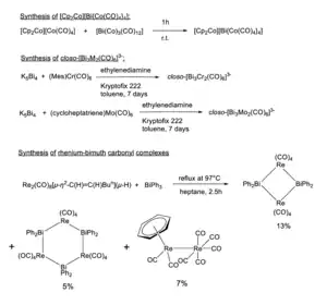 The common synthetic precursor is the trimethylsilylmethyl-cyclobismuthane. Upon reaction with tungsten pentacarbonyl, the resulting side-on adduct preserved the dibismuthene unit, while reaction with diiron noncarbonyl yields the a tetracylic heteronuclear iron-bismuth carbonyl compound (see scheme to the right).[9][10]