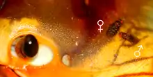 The eggs are laid around the crab's compound eyes; the first-instar larvae migrate to the crab's nephritic pad, and live there, feeding on the microbes that cleanse the crab's urine. The second instar is spent in the crab's gill chamber. The third instar has the larvae return to the mouthparts before falling to the ground to pupate.[7]
