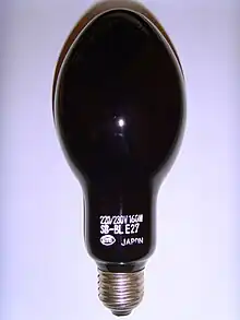 A blacklight, also called a UV-A light, Wood's lamp, or ultraviolet light, is a lamp that emits long-wave (UV-A) ultraviolet light and very little visible light.[1][2][3][4] One type of lamp has a violet filter material, either on the bulb or in a separate glass filter in the lamp housing, which blocks most visible light and allows through UV,[3] so the lamp has a dim violet glow when operating.[5][6] Blacklight lamps which have this filter have a lighting industry designation that includes the letters "BLB".[3][5] This stands for "blacklight blue". A second type of lamp produces ultraviolet but does not have the filter material, so it produces more visible light and has a blue color when operating.[3][4][5] These tubes are made for use in "bug zapper" insect traps, and are identified by the industry designation "BL".[5][6] This stands for "blacklight".