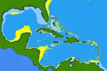 The blackfin snapper is a species of the western Atlantic Ocean. Its range extends from Bermuda and North Carolina southwards along the Atlantic coast of the United States to the Bahamas, then west into the Gulf of Mexico from the Florida Keys, the Flower Garden Banks and vicinity to Veracruz, Mexico south to the northern Yucatan Peninsula and northwestern Cuba. It also extends throughout the Caribbean Sea, along the South American coast as far south as Sao Paulo, Brazil.[1] It occurs over sandy and rocky substrates close to ledges at depths of 60 to 90 m (200 to 300 ft). The adults are found offshore close to the continental shelf, while the juveniles are normally found in rocky outcroppings in the vicinity of reefs in shallower waters at depths between 6 and 18 m (20 and 59 ft).[5]