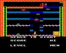 The game is divided into a series of single-screen levels. The goal of the player on each screen is to manipulate Blagger, a burglar, to collect the scattered keys and then reach the safe.[3] The keys must be collected and the safe opened in a limited amount of time. Blagger can walk left and right, and jump left, right and up. The jumping action is in a fixed pattern and cannot be altered once initiated. Gameplay involves learning the best order in which to collect the keys, and good timing of movement and jumping.