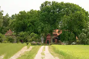 The castle was built on the north bank of the river Aller[1] above the flood plain. Today it lies on a silted-up branch of the old river. The ruins of a rampart can still be seen on the southeastern side of the former castle site; the opposite side of the embankment had been levelled around 1900. The extent of the castle has been estimated at 50 x 50 m. Today an old farmhouse stands in the middle of the site. At the beginning of the 20th century the foundations and parts of a vault were reported to have been found.