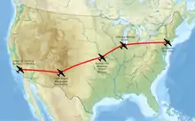 TWA's Burbank - La Guardia flight via Chicago was 2 hours quicker than for a DC-3 (13:40 east and 15:38 west) with 3 stops in each direction.[3] The main route was La Guardia, NY to Chicago, Illinois to Kansas City, Missouri to Albuquerque, New Mexico to Burbank California and the reverse.[3]