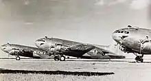 Passenger facilities were reduced to 4 bunks which when folded away allowed seating for 12, along with 4 seats along the opposite side of the aircraft.[41] Removable tables were provided in the cabin to lay out maps and do paperwork.[42] The exterior was then camouflaged in standard USAAF colours, with olive drab upper surfaces and neutral grey undersides,[10][45] and each aircraft had its name painted on the nose and over the cabin door, which would also be used by many later operators.[45] The names had previously been used in TWA publicity, but not painted on the aircraft.[8]