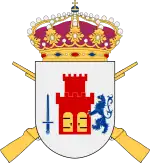 The coat of the arms of the Bohuslän Regiment (I 17) 1977–1992 and the Bohus-Dal Group (Bohus-Dalsgruppen) since 1997. Blazon: "Argent, the provincial badge of Bohuslän, a castle with a tower both embattled gules; masoned sable, two portcullis or charged with hinges and locks sable between a sword erect azure and a lion rampant of the last, armed and langued or. The shield surmounted two muskets in saltire or".[4]
