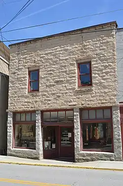 It is a two-story, stone commercial building, with construction typical for stone buildings in Hindman. Its storefront appears to be original, and includes a recessed single-door entry with angled windows.[2]
