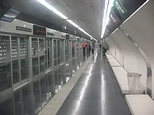 The walls of the tunnel where the platforms are located are cladded with cast stone panels with different densities, curves and perforations. The process combines white pre-cast stone with a gentle acid-etched finish and encrusted glass beads that let light filter through. Each platform is equipped with white cast stone benches with a shiny polished finish rest on cantilevered metal brackets to camouflage the station's air-conditioning outlets.[6] This project was designed by architects A&M in conjunction with Escofet while the architectural design of the station in general was designed by Tomàs Morató.[7][6]