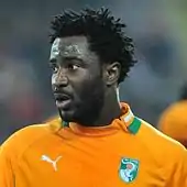 Bony was included in the Ivory Coast's 23-man squad for the 2014 FIFA World Cup.[79] In their first group match, against Japan, he scored the equalising goal with a header after a cross from Serge Aurier.[80] Ivory Coast eventually won 2–1.[81] Against Greece in the final match of the group stages, Bony came on as a substitute in the second half to score the equalising goal before the Ivory Coast lost via an injury time penalty.[82]