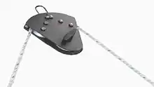 Boom brake with line. The brake shackles to the bottom of the boom, and the line attaches to the base of the shrouds; tensioning the line actuates the brake.