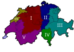 The original eight border guard regions were introduced on 1 January 2007 as a replacement for the previous four border guard divisions.[9] The Border Guard Region VII (Aargau / Zurich) with command at Zurich Airport was dissolved on 1 April 2011, and divided into border guard regions I (Canton Aargau) and II (Canton Zurich).[10]