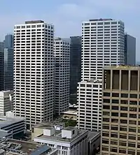 The complex was developed by Toronto based Hammerson Canada and consists of four towers built over a period of 12 years, starting with the 17-storey first tower, 39-storey second tower, 33-storey third tower and finally 38-storey fourth tower which was topped off in June 1981.[2] The buildings were designed by Webb, Zerafa, Menkes & Housden Architects and built by CANA Construction Company Limited. In 1985 Hammerson began evaluating construction of a fifth tower which would have been 17 storeys with 9,300 square metres (100,000 sq ft) of leaseable space;[2] however, the fifth tower never come to fruition. Boris Zerafa of WZMH Architects received the 1970 Canadian Architect Yearbook Award of Excellence for the design of the Bow Valley Square complex.[3] The design incorporates aspects of the International Style and is noted as one of the more elegant designs in the city for the period analogized as "Cadillac and Porsche architecture" versus the more common "sturdy Buicks and Oldsmobiles of middle management" design prevalent in Alberta during the period.[4]