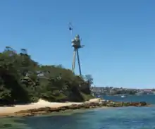 Sitting on the rock platform off the headland is a Doric stone column. It is one of six that were taken from the demolished Sydney Post Office and placed in positions in Sydney. In conjunction with the tower off Fort Denison, it was used for speed trials of vessels in Sydney Harbour. Owing to increased congestion on the Harbour, it is no longer used by the Maritime Services Board for this purpose.[3] (Another of the columns can be seen in the Mount Street Plaza, North Sydney.)