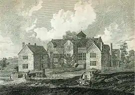 The building was at one time "a tall building, narrow in proportion to its height and length, built of flat stones or parpoints, and having a sturdy watchtower at the back, looking over the valley of the River Tame. It was surrounded by a wide and deep moat. On the front were three gables, two of them projecting from the face of the hall, the third being flush with it. The entrance doorway was in the side of the central gable, and was approached from the courtyard by a flight of steps. Passing through the doorway a heavy oak door on the right side opened at once into the Great Hall, and in the tower exactly opposite was a wide oak staircase, which led to the upper part of the house. The Great Hall occupied the whole of the ground floor of this portion of the building, and was about 33 feet (10 m) long by 24 feet (7.3 m) wide. At the end was a raised platform where the high table was situated, lighted by two loft bay windows, one at each end. The year in which some portion of the hall, if indeed not the whole of it, was erected, is fixed from the date 1597 on the spout above the entrance, and the initials and date R A 1597 on the right hand gable."