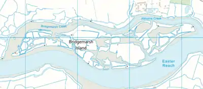 Bridgemarsh Island is in the tidal part of the River Crouch in the English county of Essex, three miles upstream from Burnham-on-Crouch. The main river channel runs to the south between the island and Canewdon, and it is separated from the mainland to the north by Bridgemarsh and Althorne Creeks, channels of the estuary.