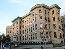 In the early 20th century, many Jewish communities saw both benefit and need in developing modern hospital facilities.[5] By 1901, local community leaders saw the need to expand the Society to a 50-bed hospital. They incorporated as Jewish Hospital of Brooklyn on November 9, 1901, and by 1903, had purchased an older hospital campus, the Memorial Hospital for Women and Children, to renovate and reopen. It was located on the block of Classon Avenue, between Prospect Place and St. Marks Avenue. Shortly after its purchase, the trustees decided that the community could support a much larger facility and spent several years fundraising, insisting that work not start until money was in hand to cover all the work.[6] This combination of expansive plans and fiscal conservatism delayed the opening by several years.[5] In 1906, as fundraising and construction continued, additional property was purchased along St Marks Avenue, and later that year, an additional adjacent tract was acquired. The additional space was used for a nursing school and dormitory, and administrative offices. On December 9, 1906, the society dedicated the Jewish Hospital of Brooklyn (555 Prospect Place); the hospital opened to patients on December 17, 1906. The nursing school had opened earlier in the month, on December 4.