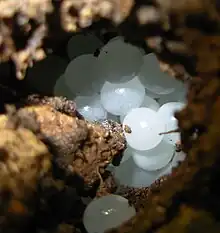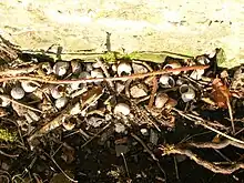 Like other Pulmonata, individuals are hermaphrodites, producing both male and female gametes. Reproduction is predominantly, and probably exclusively, by outcrossing.[30][31] During a mating session of several hours, two snails exchange sperm reciprocally. H. aspersa snails stab a calcite spine, known as a love dart, into their partner. The mucus coating the love dart contains a chemical that diverts sperm away from being digested. This is important for sperm competition because individuals mate repeatedly and the donated sperm can remain viable for 4 years.[31][32] About 10 days after fertilisation, the snail lays a batch of on average 50 spherical, pearly-white eggs into crevices in the topsoil, or sheltered under stones.[30] In a year it may lay approximately six batches of eggs.[33] The size of the egg is 3 mm.[30]