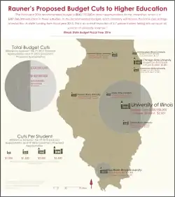 On February 9, 2015, Rauner signed an executive order blocking so called "fair share" union fees from state employee paychecks.[67][68] The same day, Rauner hired a legal team headed by former U.S. Attorney Dan Webb and his law firm Winston & Strawn to file a declaratory judgment action in Federal Court to affirm his action.[67][68] In February 2015, Rauner proposed $4.1 billion in budget cuts affecting higher education, Medicaid, state employee pensions, public transit, and local government support. In April, Rauner also suspended funding for programs addressing domestic violence, homeless youth, autism, and immigrant integration. Critics called these moves "morally reprehensible" and harmful to the state economy.[69][70][71][72]