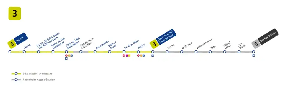 Line 3 is a planned expansion of the Brussels Metro, running from Albert, through the existing premetro (underground tram) tunnel, and eventually terminating at Bordet. As of July 2023, it is under construction.[1]