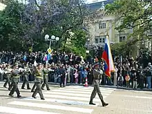 While the entire parade responses with a long Oorah!, the Band then sounds the final measures of the Armed Forces Hymn Great are our Soldiers, and as the parade presents arms, Mila Rodino is then played with a 21-gun salute.[24] The parade is then ordered to order arms and to stand at ease, and afterward the parade marches off the square in preparation for the march past as a Bulgarian Air Force helicopter commences the flypast carrying the national flag.[25] The drummers of the massed bands beat a cadence as the parade marches off the square, reforming at its southern end for the march past to begin later on led by the parade commander.