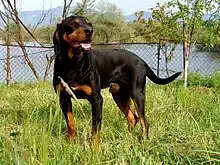 The Bulgarian Scenthound (Bulgarian: българско гонче, balgarsko gonche) is a dog breed from Bulgaria.[1][2][3] It originated in the Ludogorie region of northern Bulgaria, and is the most widely distributed smooth-haired hunting dog in Bulgaria.[1] It is a non-standardised breed but conforms to hound body morphology.[2]
