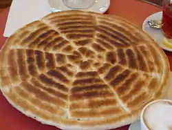 The host pours the coffee for all participants by moving the tilted boiling pot over a tray with small, handleless cups from a height of one foot without stopping until each cup is full.[3] The grounds are brewed three times: the first round of coffee is called awel in Tigrinya, the second kale'i and the third baraka ('to be blessed'). In Amharic the terms are abol (አቦል), the second tona (ቶና) and the third baraka (በረካ).[4] The coffee ceremony may also include burning of various traditional incense.[4] People add sugar to their coffee, or in the countryside, sometimes salt or traditional butter (see niter kibbeh).[3] The beverage is accompanied by a small snack such as popcorn, peanuts, or himbasha (also called ambasha).[3]