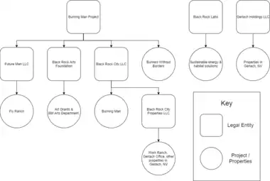 In the middle of the restructuring, the nonprofit Burners Without Borders was formed on August 21, 2012.[16] They describe themselves as an organization "whose goal is to unlock the creativity of local communities to solve problems that bring about meaningful change."[17] The following year, two LLCs were formed to hold the various property assets of the Burning Man Project. Black Rock City Properties LLC was formed on November 21, 2013,[18] and Gerlach Holdings LLC was formed shortly after on December 19, 2013.[19] Together they hold properties such as the Gerlach Office and the Work Ranch.