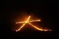 There are many locations in Japan where this ritual is held. In western Japan, the Okuribi of the Five Mountains, celebrated in Kyoto, is the most famous,[1] while in eastern Japan, the ritual during the Hakone Gora Summer Festival with the fire burned on Mount Myōjō in the Hakone Mountains is relatively well known because of its proximity to Tokyo.[2]