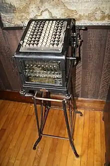The adding machine range began with the basic, hand-cranked P100 which was only capable of adding.[2] The design included some revolutionary features, foremost of which was the dashpot which governed the speed at which the operating lever could be pulled so allowing the mechanism to operate consistently correctly.[3] The machine also had a full-keyboard with a separate column of keys 1 to 9 for each decade where the keys latch when pressed, with interlocking which prevented more than one key in any decade from being latched. The latching allowed the operator to quickly check that the correct number had been entered before pulling the operating lever. The numbers entered and the final total were printed on a roll of paper at the rear, so there was no danger of the operator writing down the wrong answer and there was a copy of the calculation which could be checked later if necessary.