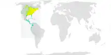 Broad-winged hawks have a wide range in North America and South America, from southern Canada to southern Brazil. Their breeding range is in the northern and eastern parts of North America, and some migrate in the winter to Florida, southern Mexico, and northern South America.[10][11] Five subspecies are endemic to the Caribbean and do not migrate. Those subspecies that do migrate fly in flocks of more than 40 up to several thousand at heights from 550 to 1,300 m (1,800 to 4,270 ft). They soar using thermals to carry them through their journey of 3,000–6,000 km (1,900–3,700 mi).[12] Fall migration lasts for 70 days as birds migrate about 100 km (62 mi) per day from North America, through Central America to South America without crossing salt water.[13] The enormous flocks of soaring broad-winged hawks are termed kettles and are characteristic of many hawk migration spectacles in North America, such as at Hawk Cliff in Ontario, Hawk Ridge in Minnesota, Hawk Mountain in Pennsylvania, and the River of Raptors in Veracruz.