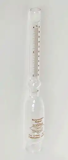 Butyrometer is a measuring instrument used to measure fat content in milk or milk products in general. The method used in the determination is Gerber's method as invented by Swiss chemist Niklaus Gerber.