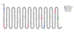No transmembrane helices,[12] potential GPI-modification sites, or TM-proteins were found. There were seven predicted sumoylation sites,[13] multiple phosporylation sites with most of them being unspecified, and nine glycosylation sites.[14]