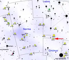 NGC 5823 (also known as Caldwell 88) is an open cluster in the southern constellation of Circinus, near (and extending across) its border with the constellation Lupus. It was discovered by Scottish astronomer James Dunlop in 1826.