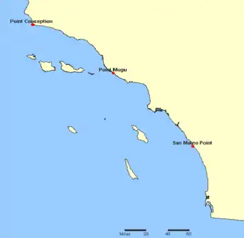 There are seven Pacific Coast breakpoints in the United States. They are, from north to south, Point Piedras Blancas, Point Sal, Point Conception, Point Mugu, the mouth of the San Gabriel River, San Mateo Point, and the mouth of the Tijuana River (although places outside this area can be selected if conditions warrant).[66] Should there be the threat of landfall, warnings or watches would be issued for those sections of the coast, which occurred for the first time ahead of Hurricane Hilary in 2023. It is highly unlikely that any tropical cyclone will threaten areas farther north, due to the stronger influence of the California Current.