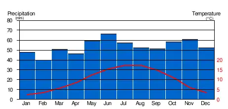 Climate in this area has mild differences between highs and lows, and there is adequate rainfall year round. The Köppen Climate Classification subtype for this climate is "Cfb" (Marine West Coast Climate/Oceanic climate).[20] However, the city is about 110 kilometres (68 mi) from the nearest coast.[note 1]