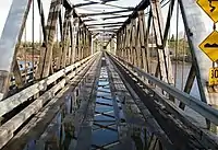 The second Cameron Street Bridge, a single-lane wooden Howe truss bridge, was built in 1931. Traffic was directed over the single-lane structure by means of traffic signals located at both ends of the bridge. The second bridge was closed in September 2005 due to structural problems. Due to the bridge's unique design, various ideas about saving the structure were considered (such as conversion to a pedestrian-only bridge). Eventually, the decision was made to demolish the old bridge and replace it with the current modern structure. However, the city decided to preserve the bridge's history by building a replica Howe truss bridge (with informative signage) carrying foot traffic nearby in Cottonwood Island Park.[2]