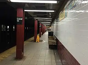 In 1922, the Rapid Transit Commission awarded a contract to the Wagner Engineering Company for the installation of navigational signs at the Canal Street station and several other major subway stations. The IRT platforms received blue-and-white signs, while the BMT platforms received red-white-and-green navigational signs.[93][94] That December, the commission approved a $3 million project to lengthen platforms at 14 local stations along the original IRT line, including Canal Street and seven other stations on the Lexington Avenue Line. Platform lengths at these stations would be increased from 225 to 436 feet (69 to 133 m).[95][96] The commission postponed the platform-lengthening project in September 1923, at which point the cost had risen to $5.6 million.[97][98] The mainline Broadway Line station's platforms originally could only fit six 67-foot-long (20 m) cars. In 1926, the New York City Board of Transportation received bids for the lengthening of platforms at nine stations on the Broadway Line, including the mainline station at Canal Street, to accommodate eight-car trains. Edwards & Flood submitted a low bid of $101,775 for the project.[99] The BMT platform-lengthening project was completed in 1927, bringing the length of the platforms to 535 feet (163 m).[100][101] The commission ordered the BMT to install additional signs at the Canal Street BMT stations in mid-1930.[102]