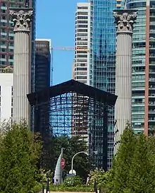 At its entrance are two 40-foot Corinthian columns salvaged from Chicago’s 1905 Federal Building. The columns are on axis with the classical columns of the Field Museum of Natural History located at the far south end of Grant Park.[3] Architect Henry Ives Cobb designed the columns. Before being placed in the Cancer Survivors Garden, the columns were submerged near the Lake Michigan shoreline in 1983 to help reinforce a breakwater.[1] The Chicago Architecture Foundation donated the columns to be placed next to the garden’s main pavilion.