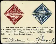 - ↑ D. Alan Stevenson, The Triangular Stamps of the Cape of Good Hope, H.R. Harmer, Ltd., New York, London, and Sydney (1950), p. 6. Illustrated, Plate 2.