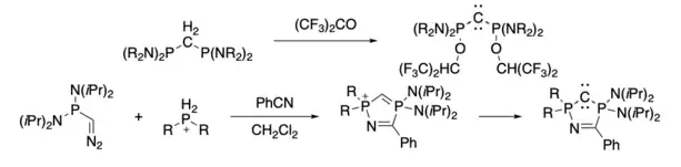 Synthetic methods have also been developed for more diverse carbodiphosphoranes. Methylenediphosphines will undergo a reaction with hexafluoroacetone[19] or thioacetone[20] to form O-substituted and S-substituted carbodiphosphoranes respectively. Cyclic carbodiphosphoranes have also been successfully synthesised through the reaction of bis(diisopropylamino)phosphino diazomethane with bis(dialkylamino)phosphenium triflate in excess benzonitrile followed by deprotonation with hexamethyldisilazide.[21]