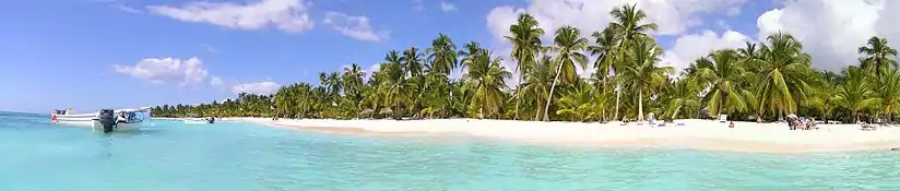 The Caribbean (/ˌkærɪˈbən, kəˈrɪbiən/ KARR-ih-BEE-ən, kə-RIB-ee-ən, locally /ˈkærɪbæn/ KARR-ih-bee-an;[4] Spanish: el Caribe; French: les Caraïbes; Dutch: de Caraïben) is a subregion of the Americas that includes the Caribbean Sea and its islands, some of which are surrounded by the Caribbean Sea[5] and some of which border both the Caribbean Sea and the North Atlantic Ocean;[6] the nearby coastal areas on the mainland are often also included in the region. The region is southeast of the Gulf of Mexico and the North American mainland, east of Central America, and north of South America.