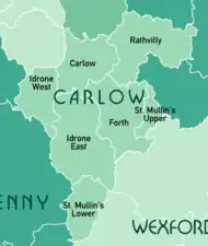 It was formerly divided into the rural districts of Baltinglass No. 2, Carlow, and Idrone, and the urban district of Carlow.[22] The rural districts were abolished in 1925.[23] Bagnelstown (Muine Bheag) and Tullow, within the former rural district of Carlow, had town commissioners. The town of Tullow was later disestablished as separate area.[24] In 2002, the urban district of Carlow and the town commissioners of Muinebheag became town councils.[25] All town councils in Ireland were abolished in 2014.[26]