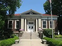 The Carnegie Library of Covington, also known as Covington Public Library, is a historic Carnegie library located at the corner of Fifth and Crockett Streets (622 S. Fifth St.), Covington, Indiana. It was built in 1913-1914 by Charles] A. Brown and is a one-story, rectangular brick building in the Neoclassical style. It has a low-pitched hipped roof, and the front facade features a one-story projecting pedimented portico.[2]: 2 The building was renovated, and a new addition was added in 1995.[3]