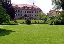 Schloss Castell (Castell palace), built in the late 17th century in Baroque style, remains the seat of the princely family of Castell-Castell. Around 1820, the formal Baroque garden was turned into an English landscape garden. Between 1863 and 1869 Graf Friedrich Ludwig (1791-1875) had the Torbau, the eastern wing and the corner pavilions rebuilt and expanded in Baroque revival style. A new stables was added at that time, which serves today as the restaurant Weinstall. Around 1870, the park was expanded based on plans by Carl von Effner. These Anlagen feature a pond, a new stables, a riding hall and the Wiedervereinigungsstein from 1991 by Theo Steinbrenner.[4]