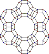 Structure of aluminosilicate cage in faujasite. Vertices are occupied by aluminium or silicon, the connecting struts are occupied by oxide (O2-) or hydroxide (OH) centers. Special modifications of faujesite are strong solid acids, which at high temperatures induce the rearrangements of C-C bonds that occur in FCC units.