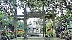 The rectangular memorial crypt faces west and is preceded by a Chinese style "spirit way" (神道) walkway and "pailou" (牌楼) gateway on which is inscribed in Chinese the line from the Apostles' Creed, "I believe in the resurrection of the body" (我信肉身之复活). It is located right next to the Xihu Beer Factory (西湖啤酒厂) on Xixi Road (西溪路) and can be entered by request.[7][8]